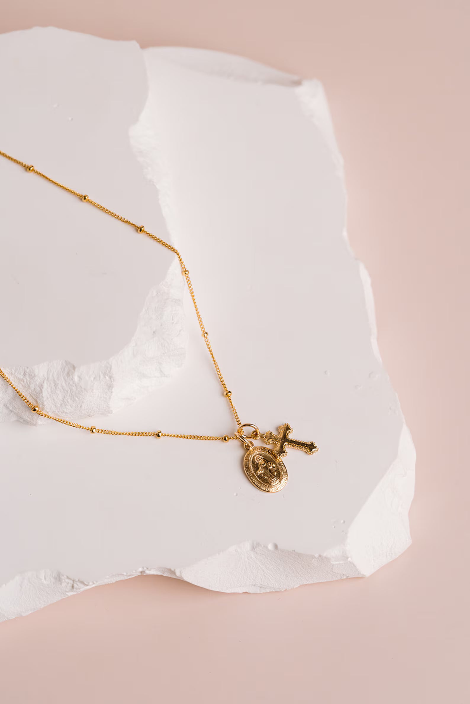 This delicate necklace features a tiny Miraculous Medal and a small cross charm — a beautiful symbol of faith and protection. It’s lightweight, easy to wear every day, and makes a thoughtful gift for someone special or a meaningful piece just for you.